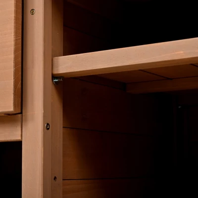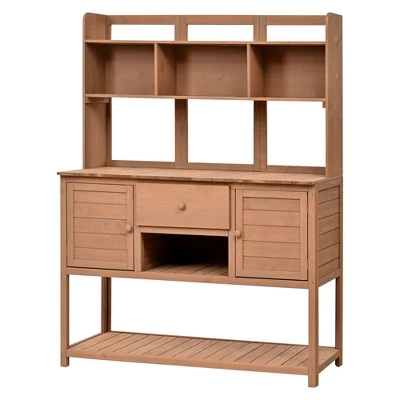This versatile potting bench is a perfect blend of functionality and rustic charm, making it an ideal addition to your outdoor space. Crafted from 100% natural fir wood, this garden workstation is built to withstand the elements, offering a sturdy and durable surface for all your gardening tasks. With a spacious 50.2×19.7-inch countertop, this potting bench provides ample workspace for potting plants, organizing tools, or handling DIY projects. The upper hutch features a top shelf and three middle grids, providing convenient storage for pots, small tools, or decorative items. Below, you’ll find two adjustable cabinets and two bottom shelves that offer flexible storage space, making it easy to customize your storage needs. Additionally, the bench includes one drawer for smaller accessories and three side hooks to hang tools or gardening gloves, enhancing the overall organization of your outdoor space. Designed for comfort and stability, this potting bench features a counter-height surface that reduces back strain during extended gardening sessions. The anti-tipping ground nails ensure that the bench remains stable, even on uneven surfaces, making it a reliable workstation for all your outdoor projects. Whether you’re potting plants, organizing tools, or tackling DIY tasks, this potting bench is the ultimate practical and stylish solution for your outdoor needs.