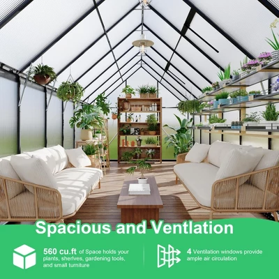 UV-Blocking Polycarbonate Panels: Our aluminum greenhouse is equipped with UV-protected polycarbonate panels, which act as a protective umbrella for plants. These panels efficiently filter out harmful UV rays while allowing beneficial sunlight to pass through, promoting healthy plant growth. By keeping UV rays at bay, they create an ideal environment for plants to thrive without the risk of sunburn.