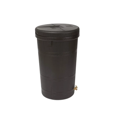 Make a stylish contribution to environmental conservation using the Good Ideas 50-Gallon Rain Barrel and Universal Rain Barrel Stand in your daily routine. This thoughtfully designed rain barrel, boasting a generous 50-gallon capacity, is an ideal starting point for your eco-conscious endeavors.Enhancing the appeal of your outdoor space, the water barrel features an attractive brown hue and a finish that mimics the texture of wood grain slats, providing a realistic and visually pleasing aesthetic. The inclusion of a worked-metal-ring texture further adds to its authentic appearance. The barrel is conveniently divided into two pieces, with a user-friendly, easy-to-remove lid that simplifies the cleaning process, ensuring that maintenance is a breeze. Beyond its visual appeal, these rain barrels prioritize functionality with double brass spigots and a mesh screen. These features keep pests at bay and effectively filter out any undesirable debris from your collected rainwater. One of the biggest challenges with most rain barrels is that the spigot sits too high, leaving a significant amount of water trapped below it—wasted and potentially stagnant. Meanwhile, barrels with low spigots offer no room to fit a bucket underneath. The Rain Wizard Universal Stand eliminates both problems by raising your barrel off the ground, allowing easy access to the spigot while ensuring more complete water drainage.This stand fits nearly all Good Ideas rain barrels with round bases ranging from 19 to 26 inches (excluding Riverwalk, Savannah, and Amphora series). Its durable, UV-resistant polyethylene resin construction supports over 1000 pounds of water weight, ensuring lasting strength and performance in all weather conditions. The flat-back design minimizes the footprint against walls, fences, or sheds—perfect for tight spaces.Upgrade your rainwater system today with the Rain Wizard Universal Stand—smart, sturdy, and stylish support for your sustainability efforts.