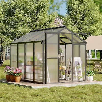 This Polycarbonate Greenhouse Kit Features A Robust Aluminum Frame, Uv-Protected Panels For Optimal Light, Adjustable Ventilation, Efficient Rainwater Management, A Spacious Design, And A Slide-In Panel System That Speeds Up Assembly By 40%, Providing A Durable And User-Friendly Outdoor Gardening Solution.
