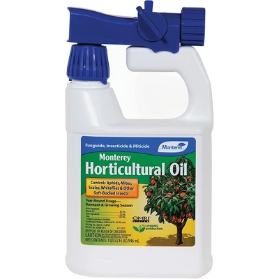 Monterey Horticultural Oil. Our product is a uniquely formulated paraffinic horticultural oil designed for both dormant & summer usages. It controls insects by suffocation rather than poisoning them. It will kill eggs, larvae & adult insects. However, you must physically spray the insect in order for it to be effective. It is very effective on aphids, whiteflies, mites, mealy bugs and scales. It can be used on all ornamentals, vegetables, herbs, fruit tree, nut & vine crops. About Monterey: Monterey Lawn and Garden Products is a leading manufacturer of plant protection chemicals and fertilizers. We strive to offer home gardeners the same professional-grade technology available to the agricultural industry. Our growing line of products provide economical and effective solutions to yard and garden problems, and are properly registered and labeled to be sold to and used by the home gardener.