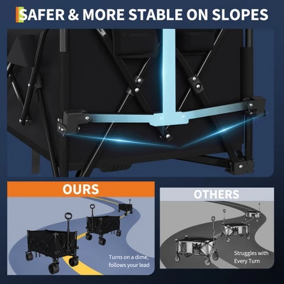 Introducing Our Collapsible Wagon Cart with Wheels, the perfect companion for your outdoor adventures. This folding utility wagon offers a heavy-duty design that combines durability with convenience, making it ideal for camping, beach trips, gardening, and more.No assembly is required thanks to its innovative design, allowing you to set up or fold the wagon in seconds. When folded, it measures a compact 8.6 x 10.2 x 26.8 inches, making it easy to store and transport. The handle on the cover ensures smooth movement and effortless carrying wherever you go.Equipped with four large 7-inch by 4-inch all-terrain wheels, this beach wagon glides smoothly over sand, gravel, grass, and virtually any surface. The strong steel frame and durable 600D Oxford fabric provide excellent support and longevity, able to handle heavy loads with ease.This wagon features a deeper and larger storage capacity, with unfolded dimensions of 38.5 x 22.8 x 35 inches, giving you ample space to carry all your gear. Two integrated water bottle pockets on the front add extra convenience, keeping your drinks or small items within easy reach.Whether you’re heading to the beach, camping, or running errands, the Collapsible Wagon Cart is designed to make transporting your belongings effortless and efficient. Experience the perfect blend of strength, portability, and smart design with this versatile folding utility wagon.